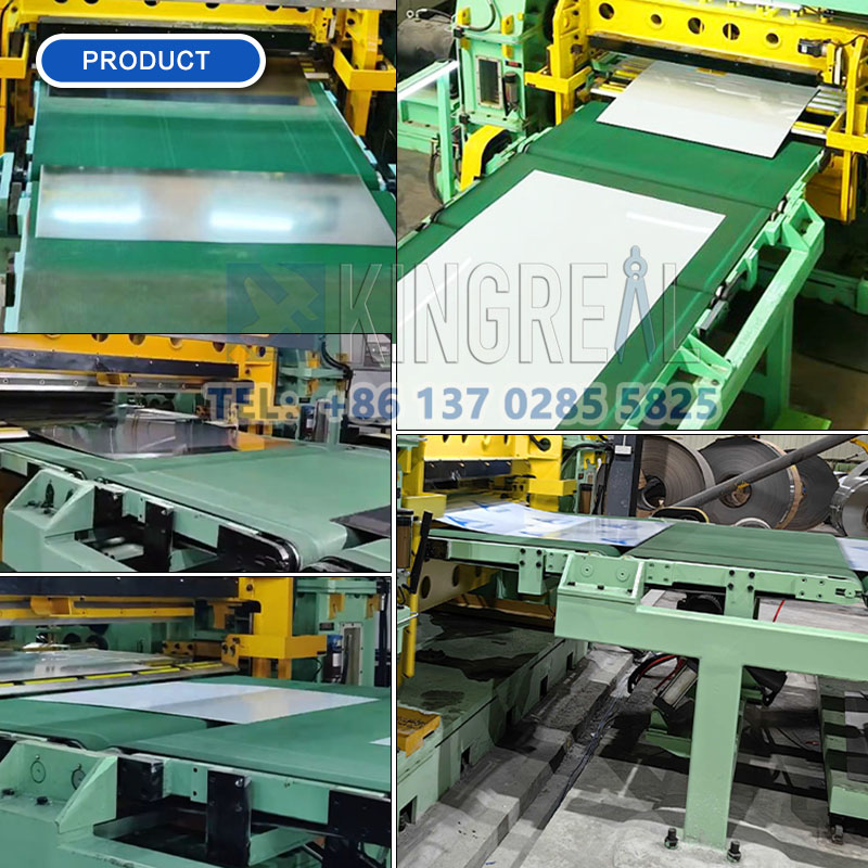 KINGREAL STEEL SLITTER linia completă de tăiere automată la lungime este proiectată pentru tăierea diferitelor bobine de material în foaia necesară și stivuirea profilului, care constă în principal din decoiler, nivelator cu clemă, tăietor, stivuitor etc. și este echipat cu dispozitive auxiliare, cum ar fi alimentator, dispozitiv de ghidare lateral, dispozitiv de tranziție, transportor etc.